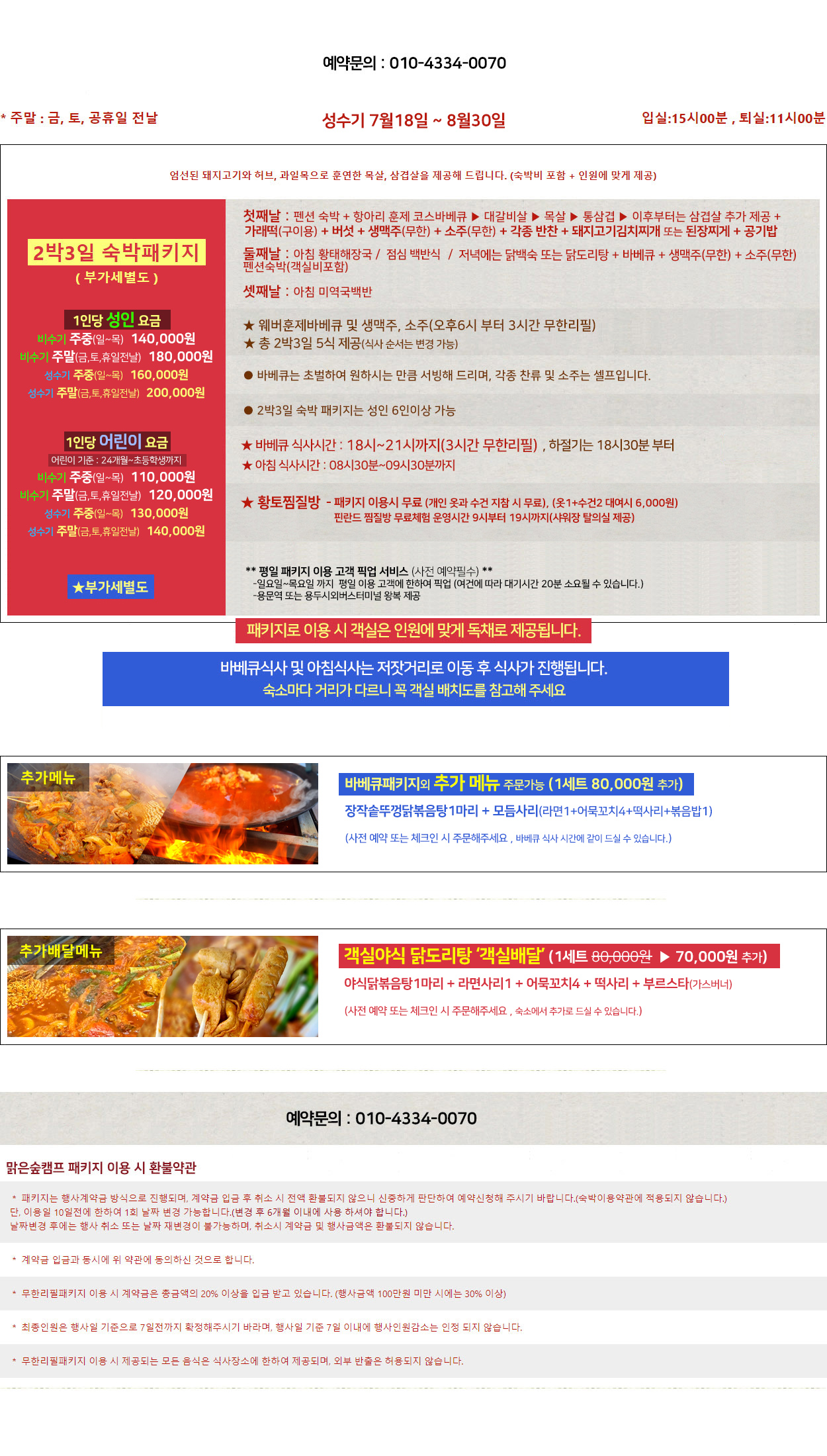 숙박 / 패키지 문의 : 010-4334-0070 | 찜질방 / 닭볶음탕 문의 : 010-3253-8677