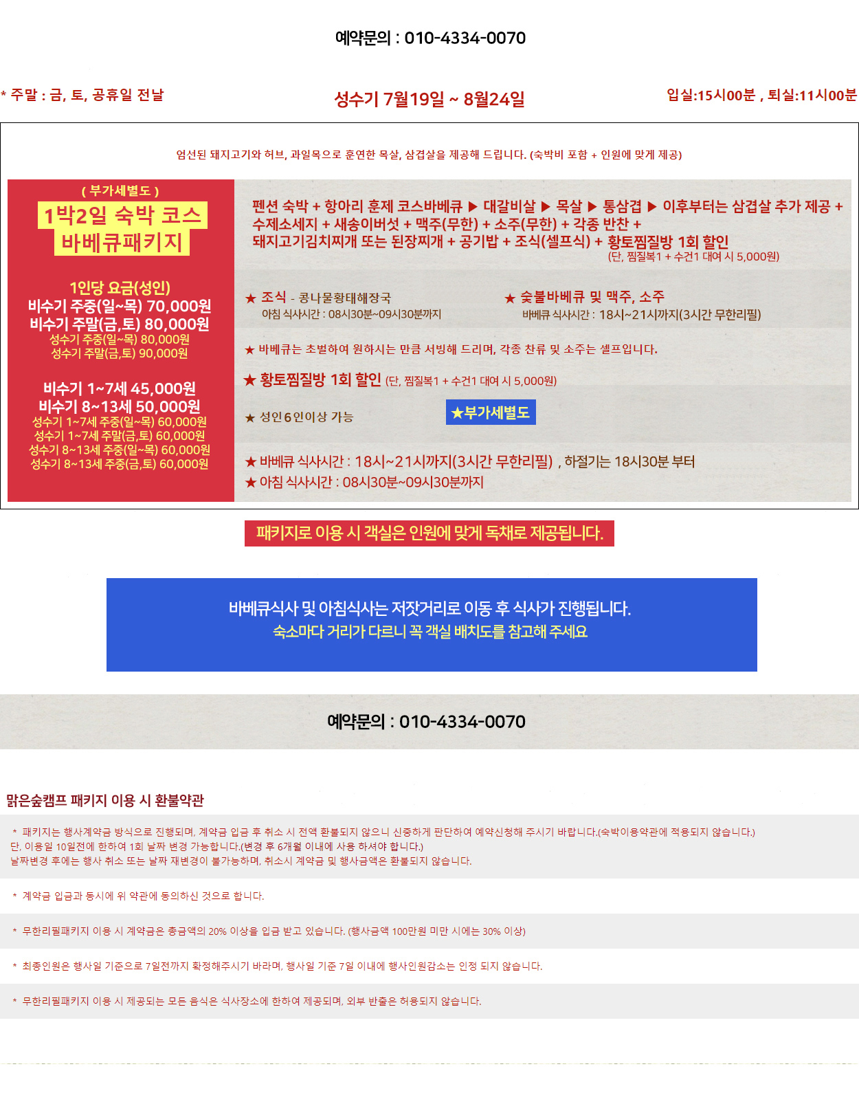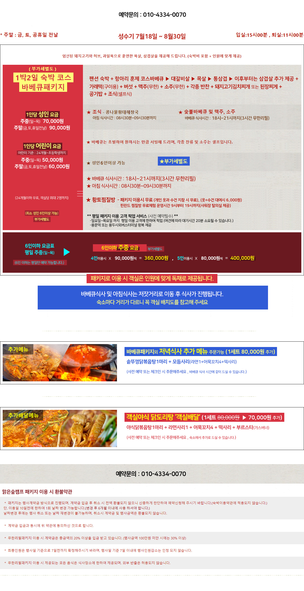 | 예약문의 : 010-4334-0070 | 패키지 예약현황보기 ▼ | 캠핑장 실시간예약하기 ▼ | 단체견적문의 ▼ | 솥뚜껑닭볶음탕 예약하기 ▼ |