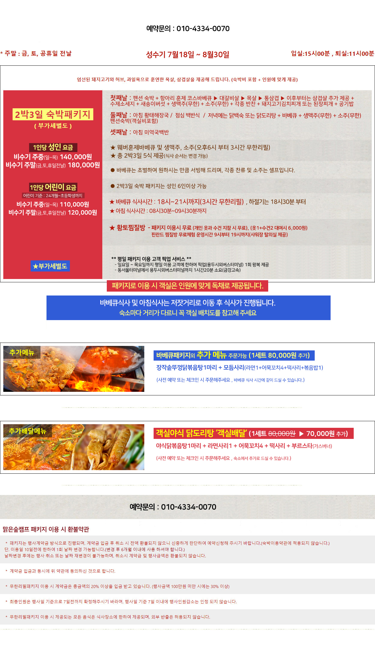 | 예약문의 : 010-4334-0070 | 패키지 예약현황보기 ▼ | 캠핑장 실시간예약하기 ▼ | 단체견적문의 ▼ | 솥뚜껑닭볶음탕 예약하기 ▼ |