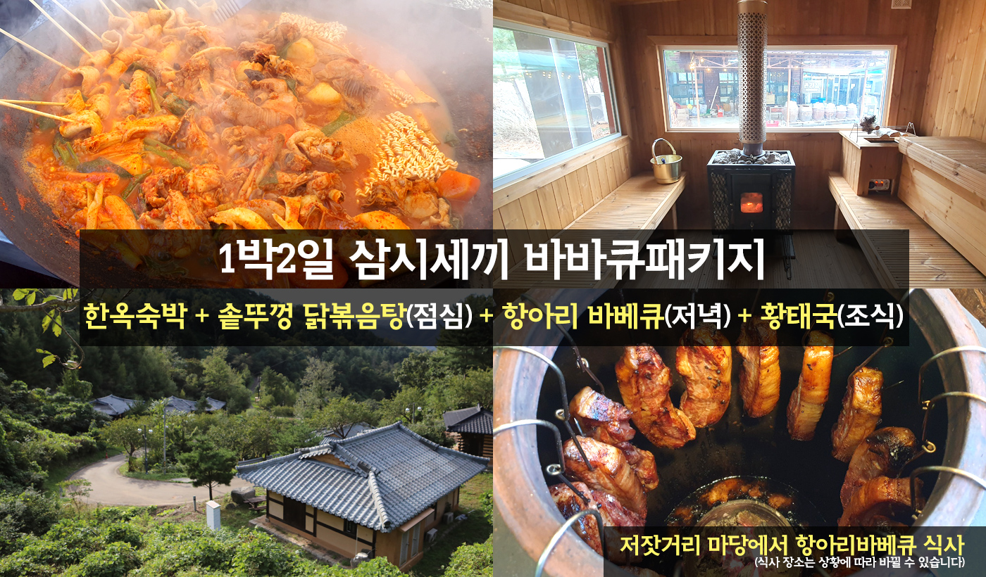 한옥숙박 + 솥뚜껑 닭볶음탕(중식) + 저녁 항아리 바베큐(석식) + 황태해장국(조식)